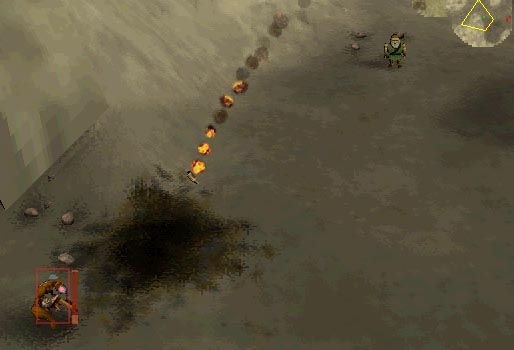 Immediatly after starting, I threw a cocktail at the ground to the north. This made me visible and sent the ghols coming. The ghols will all come to attack you, in SINGLE FILE. Well, Balin can toss cocktails very quickly. If you just attack the ghols as they get in range (not moving yourself), they will all come over and die, one after another. There are about 13 or so in the first wave (shown in the picture to the left). The next wave is the soulless that were guarding the gate you were supposed to sneak through. They will come as two groups of two (shown in the picture to the left). The well-placed cocktails should kill all four (two per shot). Balin may take a few spears in this exchange, but he's strong enough to survive it. Once the soulless are dead, you can move more freely. There are no more enemies on this side of the gate. Move Balin up to the gate to the east. The gate is just two hills with spikes sticking up out of the ground in between them. |