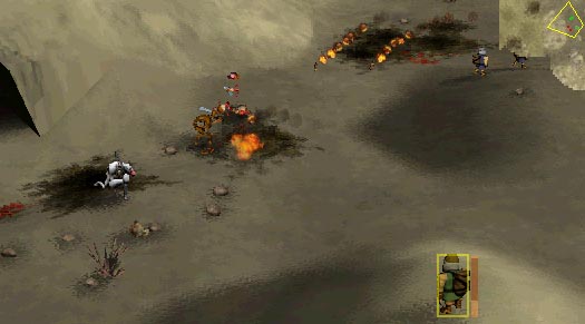 Once all the ghols in the city are dead, go back out the north gate. It's time to call in your buddies. Hit the "T" key and click on a spot. Balin will throw a blue smoke grenade, and your paratroopers will arrive. Normally, you would get 10+ dwarves to help you. However, the way I did it, I only got three dwarves, possibly because I went in and killed the ghols inside already (see picture). In any case, gather your dwarves up and get ready to go back into the cave city. Take your dwarves and go into the cave city again. The ghols in the holes will now come out to attack. Flank the holes with your other dwarves while Balin does most of the killing from the front. You can see this in the image to the left. Go to each hole in turn, killing all the ghols. In two ot the holes, there will be wights. When the come out, kill them from a distance with Balin. It's not a problem as long as you make sure you are paying attention when the attacks come. At almost every hole, you will be attacked from two directions at once. Be prepared, and take the high ground whenever you can. |
