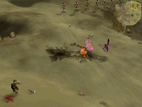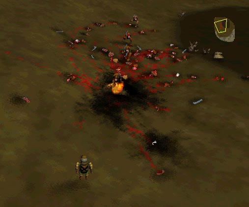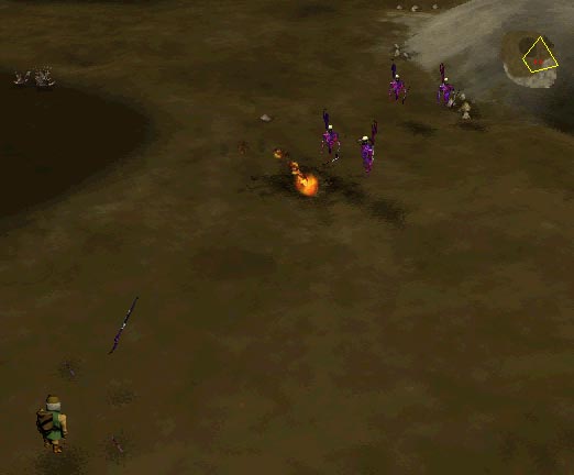 When you get to the gate to the caves, Balin will say something to the effect of "I'd better wait for backup." Ignore this, and go on in. When you get in there, you'll see ghols guarding holes. These ghols are the lookouts. Kill them. If you try to attack them directly, they may flee or charge you. However, if you control-click on the ground near them, you can kill them and they will just sit there, oblivious (see picture, left). Kill all the ghols inside the ghol cave city this way.
