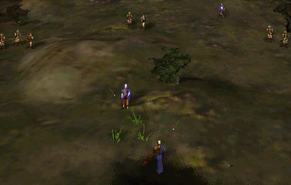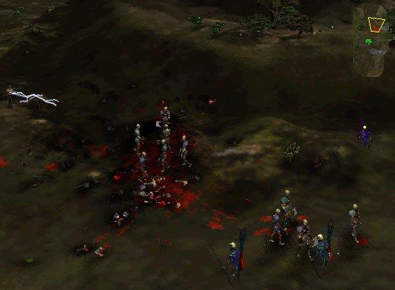 After finishing off wave 1, send a unit to scout ahead until you encounter wave 2 (see map to the left). Move back, and you'll see another group to your right. Retreat, and the two groups will fight. This battle can bee seen in the picture to the left. Notice the light and dark units. These represent the units of the two Dark armies. You can gauge when they will attack you by how many heterogenious units are left. The most dangerous units on this level (other than Scaripant) are the fetch. Luckily for you, most of the fetch will die before you have to face them. When the battle is over, bring in your archers to clean up the remaining soulless and thrall. |