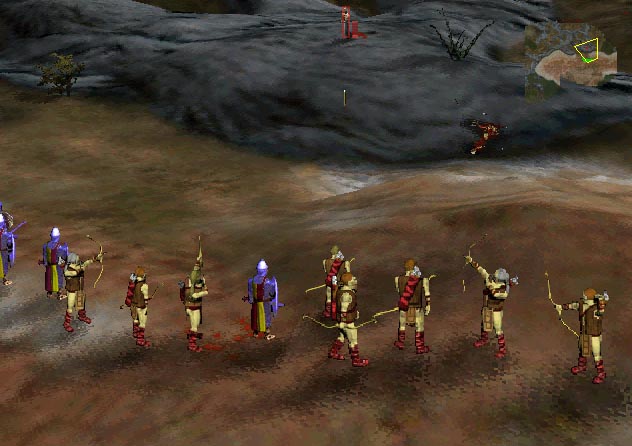 Keep your units away from the battle, as shown in the second map to the left. You will do well to avoid this wave as much as possible, because there are at least three fetch in one of the armies (the other is too far away in the film to see completely). Luckily, the fetch were all killed by soulless, leaving the work of your forces to simply killing a few survivors. After finishing off the next wave, move around the hill to the left. There si yet another battle raging here (see map to the left). Move your archers up to higher ground to fight off the remaining units. In my case, there was one lone fetch surviving, but my archers finished him off without a problem (see picture to the left). |