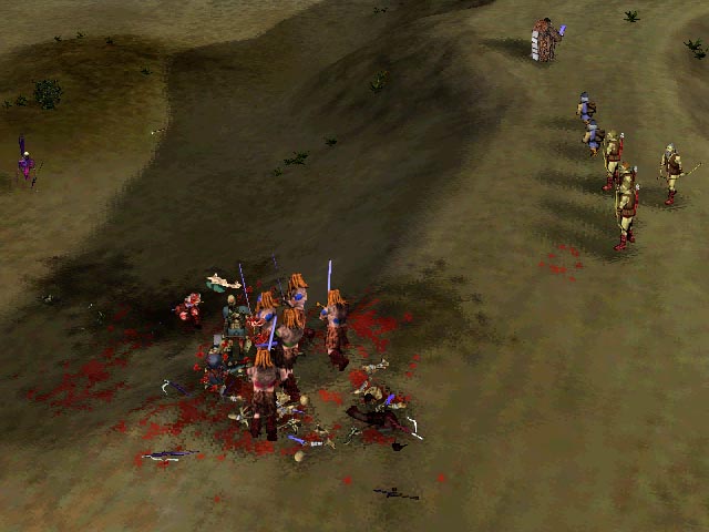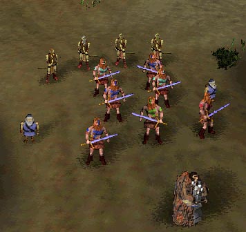 The second option is the one I took. I send my berzerkers to fight the force while my dwarves and archers moved to higher ground to attack. Meanwhile, the journeyman ran for the exit. This worked well enough, and I completed the level. When you fight the group, take out the fetch as soon as possible. He is the biggest threat to your army. Don't let the myrimidons get to your other units, but be sure that if the fetch is alive there are enemy soldiers between you and him (he'll still shoot, but hopefully he'll hurt them instead of your guys).